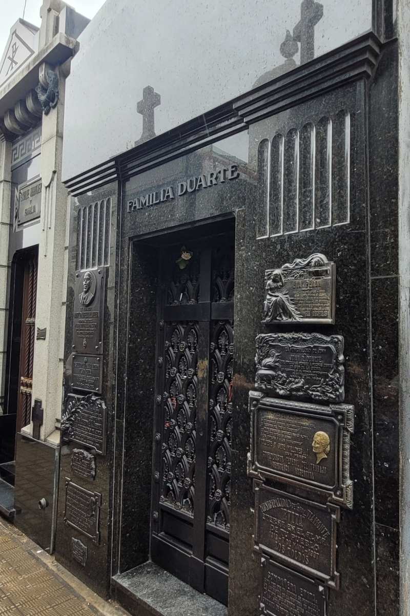 Auch viele bedeutende Persönlichkeiten haben auf dem Friedhof La Recoleta ihre letzte Ruhestätte gefunden. Insbesondere die Grabstätte der Nationalheldin Eva Duarte de Perón, Evita, zieht die Besucher magisch an. Das Grab der Familie Duarte liegt eher unscheinbar in einer Seitenstraße. Doch die Menschenansammlung vor dem Pantheon aus schwarzem Stein zeigt uns, dass wir richtig sind.