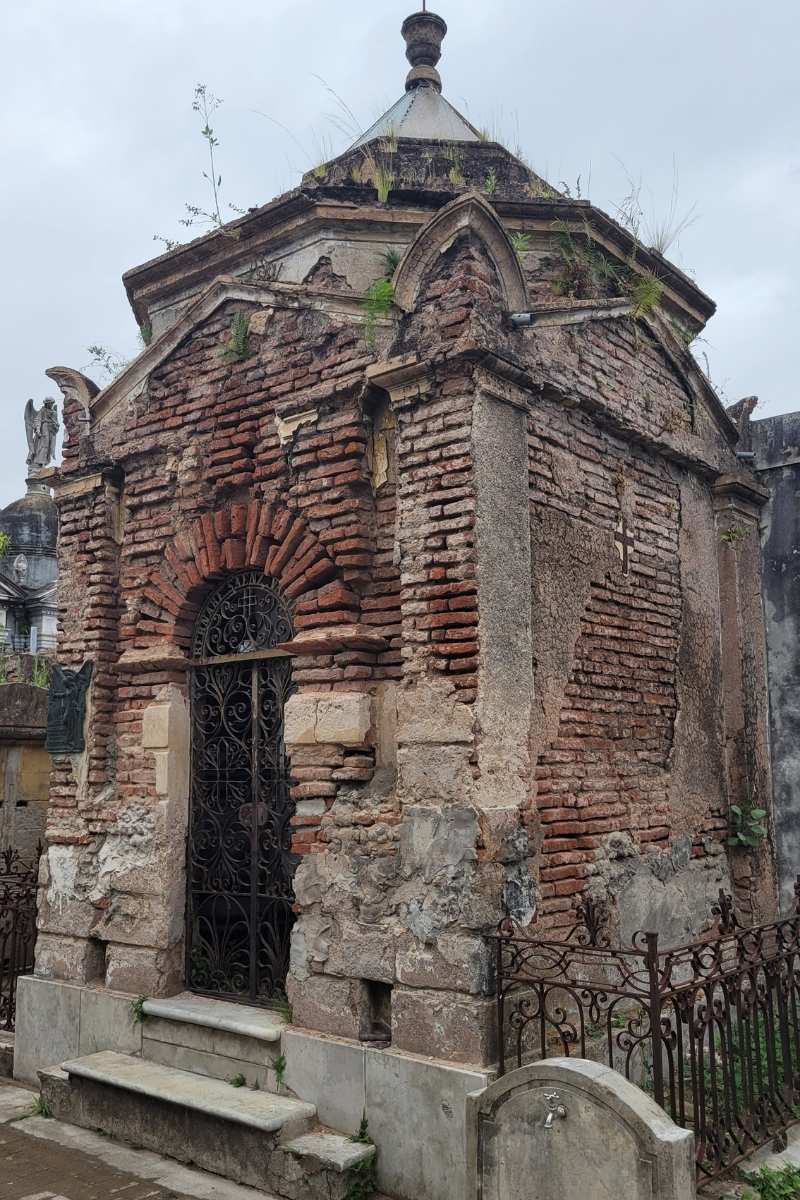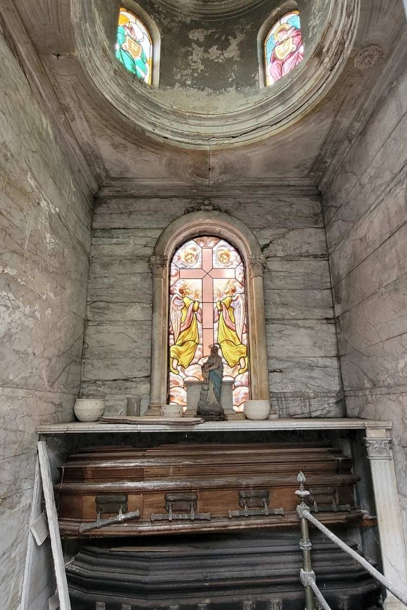 Die Vergänglichkeit des Vergangenen ist auch hier deutlich spürbar. Und mehr als das: An vielen Grabstätten nagt der Zahn der Zeit, sie sind baufällig geworden. Wo die Türen einst verschlossen waren, sieht man heute direkt in den Abgrund des Todes. Durch die zerbrochenen Scheiben der Türen erhaschen wir immer wieder Blicke ins Innerste der Mausoleen: kleine Altare mit Christus- und Marienfiguren, bunte Glasfenster mit Heiligendarstellungen, Treppenstufen nach unten. In vielen Gruften zeigen sich verwitterte Särge, große und kleine, die das schwere Schicksal der Familien nur erahnen lassen.