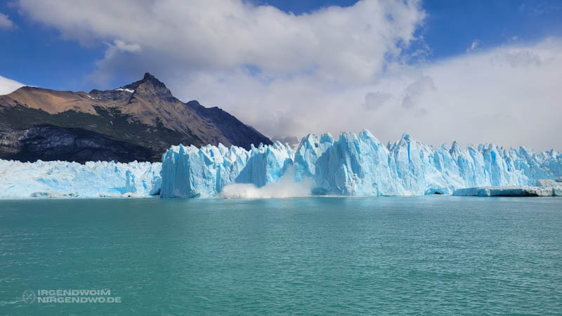 Wir sind an unserem ersten Zwischenziel angekommen. Das Boot kreuzt vor der imposanten Abbruchkante des Spegazzini-Gletschers. Die weiße Wand vor uns türmt sich stellenweise 130 Meter hoch auf. Donner grollt. Alarmiert blicken wir die Gletscherwand entlang, um einen Eisblock beim Fallen zu beobachten. Zu spät. Wir sehen gerade noch, wie die letzten Eisbrocken des Gletscherabbruchs ins Wasser bröckeln und sich die Welle unten entlang der Gletscherkante ausbreitet. Wie bei einem kleinen Tsunami zieht die Kraft der Natur das Wasser für einen Augenblick zurück, ehe sie es im nächsten Moment an der Wasserkante des Gletschers entlang schwappen lässt.