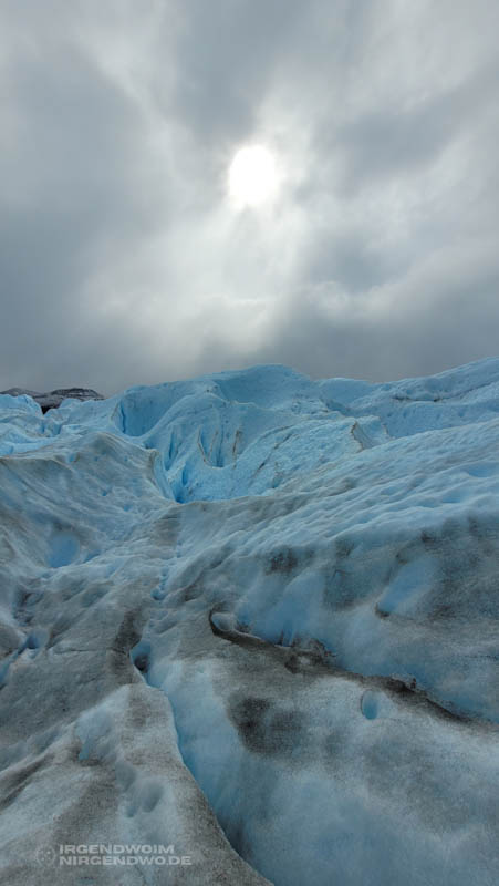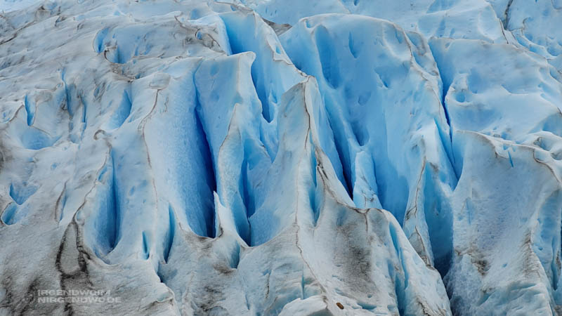 Feinstes Sediment verleiht dem Lago Argentino seinen unverwechselbaren Charakter. Das Schmelzwasser der Gletscher trägt die feinen Partikel in den See ein. Bäche rinnen von der Gletscheroberfläche in den See und so glasklar und einladend das Schmelzwasser auf dem Gletscher noch ist, so ungefiltert und trüb erscheint es später.