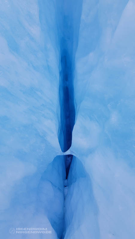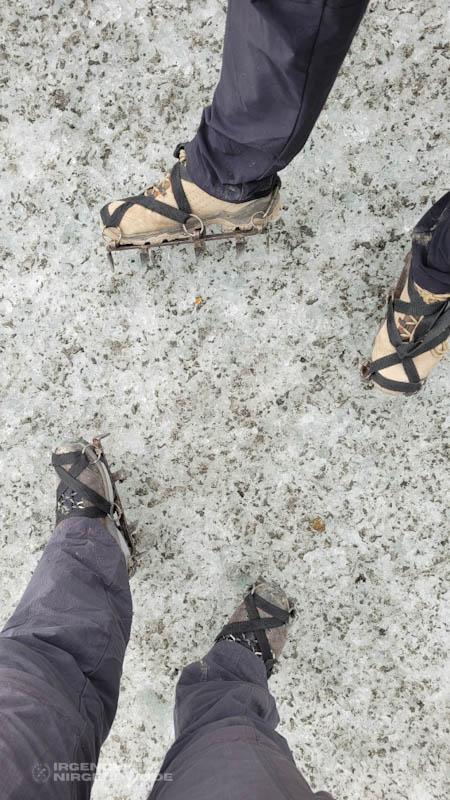 Die Eiskristalle bringen die Oberfläche des Gletschers zum Glitzern. Das Licht bricht sich darin und funkelt. Diese liebliche Anmutung täuscht fast ein wenig über die Härte des Eises hinweg. Die Kristalle sind so fest und scharfkantig, dass das Tragen von Handschuhen unerlässlich ist. Ein unbedachter Moment, ein Rutschen und Aufstützen reicht schon aus, um sich an diesen Klingen aus Eis zu verletzen.