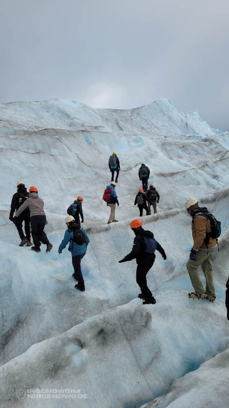 Der Perito-Moreno-Gletscher übt eine solche Faszination auf uns aus, dass wir in den kommenden beiden Tagen an und sogar auf den Gletscher zurückkehren. Denn wir wollen noch näher ran an diese Schönheit aus Eis und Wasser. Eine professionell organisierte Trekkingtour führt uns vom Rand des Gletschers bis in die Schmelzzone hinein. Mit festen Schuhen, Steigeisen und Helm ausgerüstet, stapfen wir durchs Eis. Die spitzen Zacken der Steigeisen bohren sich bei jedem Schritt in den Untergrund und geben uns Sicherheit. Ein paar Schritte noch, ein paar ins Eis gehackte Stufen hinauf und über ein paar schmale Gletscherspalten hinweg. Bald schon sind wir mittendrin.