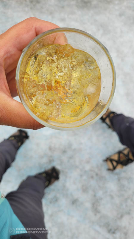 Dazwischen liegen ausgespülte, in sich verwundene Gletscherspalten, deren Grund man weder sehen noch erahnen kann. Schmelzwasser bahnt sich seinen Weg hindurch, sodass aus der Tiefe des Perito-Moreno-Gletschers ein dumpfes Gluckern erklingt. An vielen Stellen steht das Wasser bis oben in den Spalten: bestes Gletscherwasser, so rein und unschuldig wie kaum sonst etwas. Sich mit der Hand einen Schluck zu schöpfen und zu trinken, das kalte, klare Wasser auf der Zunge zu spüren, bleibt einer dieser eindrücklichen Momente auf unserer Reise. So wie der Whiskey mit Eiswürfeln aus reinstem Gletschereis, der uns zum Abschluss unserer Trekkingtour auf dem Perito-Moreno-Gletscher gereicht wird.