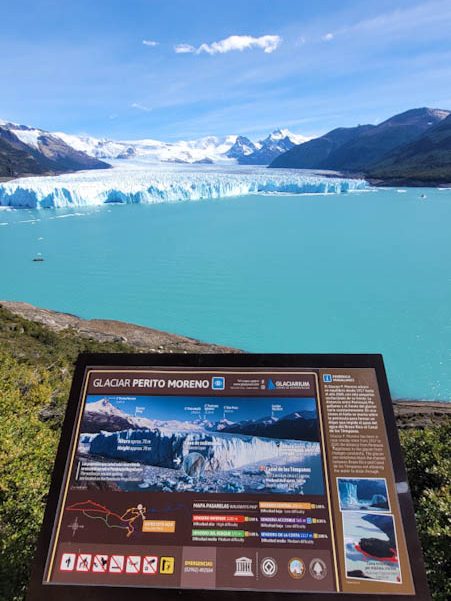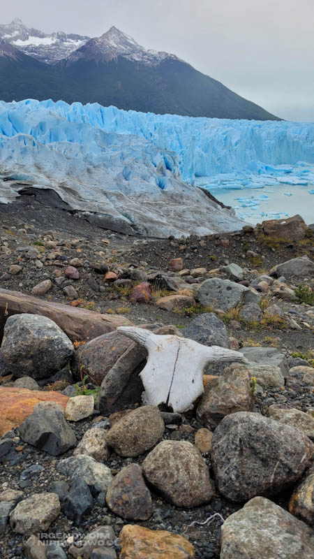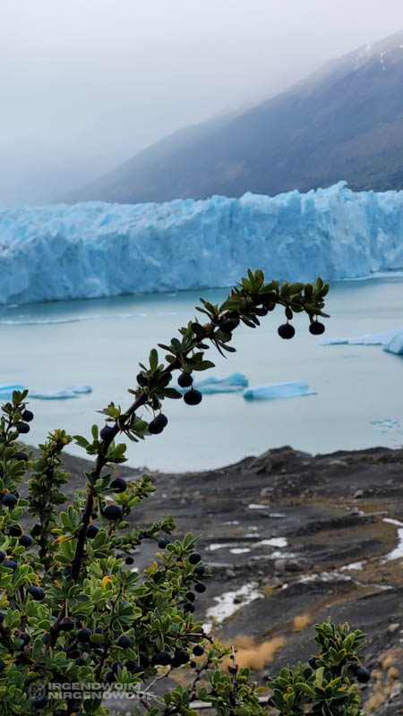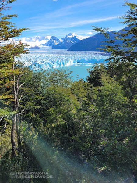 Am dritten Tag unseres Besuchs in diesem Teil des Parque Nacional Los Glaciares schwingt das Wetter endlich um und rückt den Perito-Moreno-Gletscher ins beste Licht. Das Blau strahlt heute noch viel intensiver und wir können uns an diesem Wunder der Natur einfach nicht sattsehen. Die künstlich für Touristen angelegten Wanderstege ermöglichen uns noch mal neue Blicke auf den Gletscher. Mit etwas Abstand betrachtet, erschließt sich für uns seine wahre Größe. Die Eismassen erstrecken sich über Berge und Hügel bis in weite Ferne. Sie schieben sich uns entgegen, Millimeter um Millimeter, Zentimeter um Zentimeter.